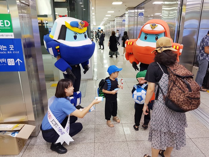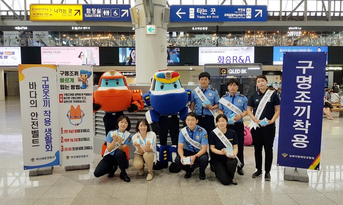 | ▲남해지방해양경찰청은 18일 부산역에서 구명조끼 입기 캠페인을 벌였다.(남해 지방해양경찰청 제공) |