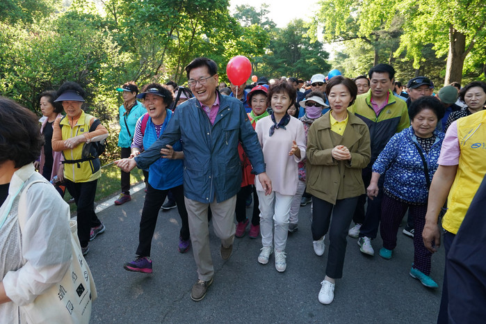 ▲18일(토) 오전 7시, ‘2019 구민 한마음 걷기대회’에서 유덕열 동대문구청장이 주민과 함께 홍릉숲을 걷고 있다.(동대문구 제공) |