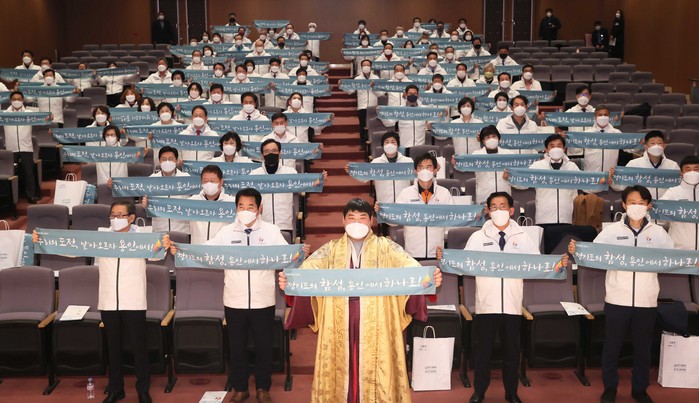 | ▲백군기 용인시장이 6일 ‘2022년 경기도종합체육대회 조직위원회 발대식'에서 백두장사 김동현, 김기준 용인시의회 의장 등 참석자들과 성공개최를 다짐하는 퍼포먼스를 하고 있다. |