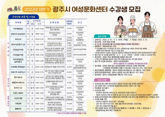 또한, 광주시 여성문화센터는 광주시 여성들의 복지증진 및 사회진출 지원을 위한 2022년 상반기 광주시여성문화센터 교육강좌를 오는 14일부터 7월 1일까지 진행한다.