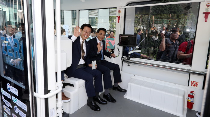 | ▲이재명 경기도지사(왼쪽)가 4일 오전 경기도 성남시 판교 제2테크노벨리 기업지원허브앞 도로에서 출발한 '제로셔틀'에 타고 활짝 웃고 있다. |