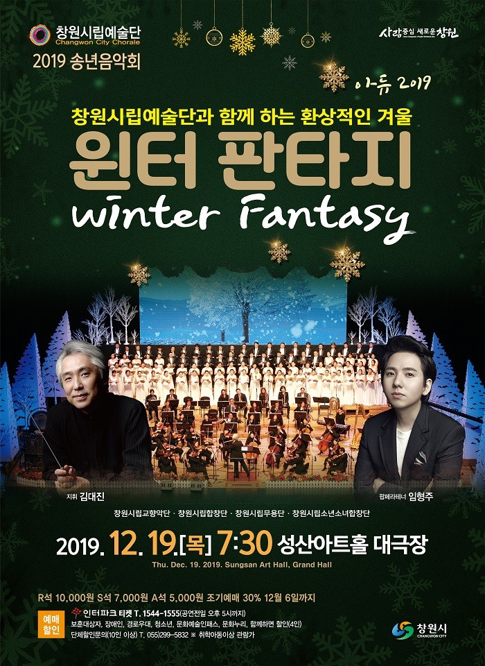 '윈터 판타지'라는 주제로 열리는 이번 송년음악회는 창원시립교향악단, 창원시립합창단, 창원시립무용단, 창원시립소년소녀합창단, 네 개 단체가 총출연하고, 세계적 팝페라테너 임형주가 함께 해 환상적인 겨울을 닮은 무대가 될 계획이다.