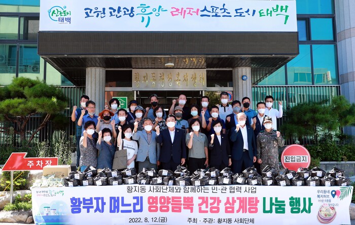 [로컬세계=박상진 기자]강원 태백시 황지동 사회단체는 12일 민.관 협력사업 일환으로 말복을 맞아 폭염으로 건강이 염려되는 홀몸 어르신과 취약계층 등 230가구를 대상으로 ‘황부자 며느리 영양듬뿍, 건강 삼계탕 나눔 행사’를 실시했다.