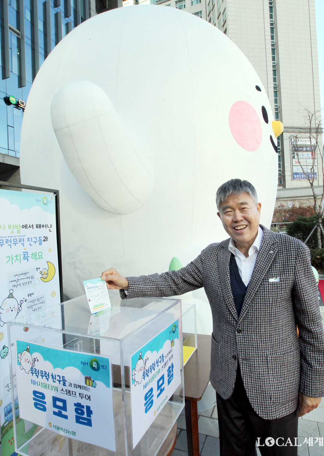 서울축산농협(조합장 진경만)은 8일, NH서울타워 광장에서 농협상호금융 공식 캐릭터 ‘무럭이(무럭무럭 친구들)’ 조형물 공개 및 테이프 커팅식을 개최했다. 진경만 서울축산농협 조합장이 ‘무럭무럭 친구들과 함께하는 NH서울타워 스탬프투어’ 응모함에서 신청 포즈를 취하고 있다.