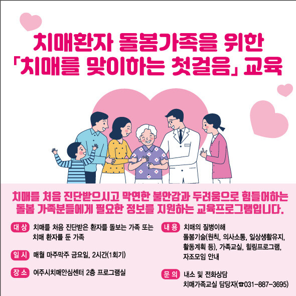 '치매를 맞이하는 첫걸음 교육'은 치매에 대한 질병이해와 치매환자를 대하는 기본원칙, 의사소통 방법, 부적절한 행동에 대한 대처방법 등으로 구성된 치매기초교육이며. 교육은 매월 마지막주 금요일 오후 2시부터 2시간동안 여주시치매안심센터에서 실시되며, 첫 진단을 받은 치매환자의 가족과 보호자면 누구나 참여 가능하다.