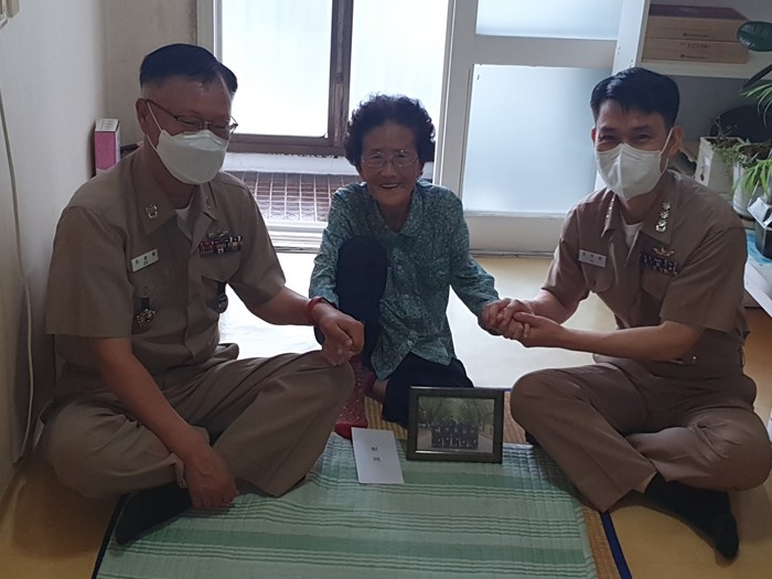 ▲유주현대령 해군작전사령부 인사참모장은6월 호국보훈의 달을 맞아 남구에 거주하는 6.25 참전유공자 및 보훈가족5명에 위문금을 잔달하는 현장 모습 |