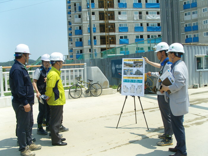 ▲김철래 부시장(노란색 상의 입은 이)을 비롯해 특별점검반이 관내 아파트 공사현장을 방문해 현장 관계자로부터 공사진행현황에 대해 설명을 받고 있다. |