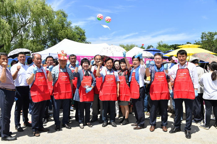 ▲서동연꽃축제에서 수박화채행사에 앞서 화이팅을 하고 있는 박정현(우측에서5번째)부여군수.(부여군 제공) |