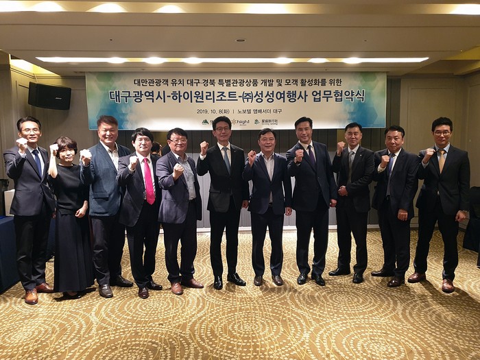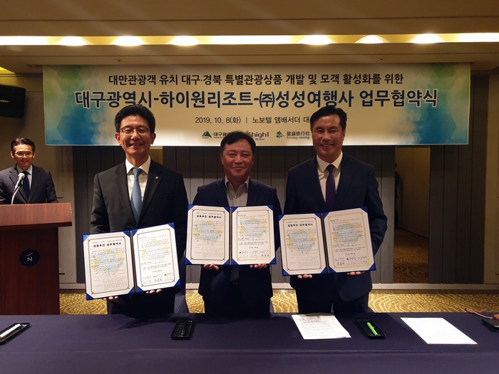 [로컬세계 박상진 기자]하이원리조트는 대구공항으로 한국을 방문하는 대만 단체 관광객 유치를 위해 8일 대구시 노보텔 호텔에서 대구시-성성여행사와 업무협약식을 가졌다고 밝혔다.
