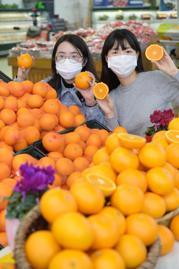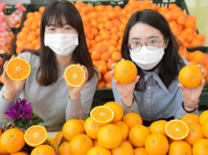 ▲4일 서울 서초구 소재 농협 하나로마트 양재점에서 모델들이 올해 첫 출하된 국내산 청견 오렌지를 선보이고 있다. 하나로마트 양재점에서는 올해 첫 출하된 국내산 청견 오렌지(1.2kg)를 8,800원에 구매할 수 있다./농협유통 제공 |