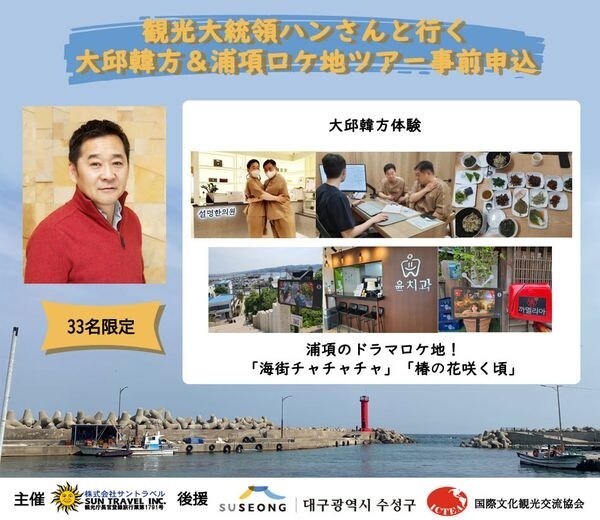 [로컬세계=박세환 기자] 대구 수성구(구청장 김대권)가 ‘관광대통령 한상과 함께 가는 대구 한방 & 포항 드라마 촬영지 투어’ 참가 사전접수를 모집 이틀 만에 모객을 완료(1차 모객인원 33명)했다고 22일 밝혔다.