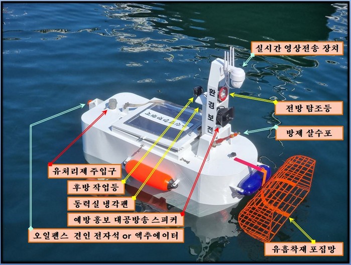 부산해경에 따르면 이번에 개발한 무인정은 방제정과 경비함정의 접근이 어려운 저수심(1m) 해역 및 선박 밀집지역에서 원격제어를 통해 실시간 현장 영상전송 및 오일펜스 설치, 유흡착제 수거 등 방제조치와 해상경비.안전에도 활용도가 높은 장비라 말했다.