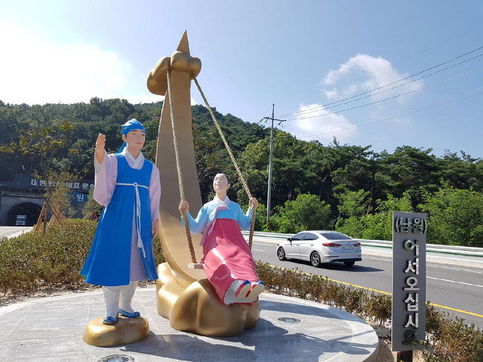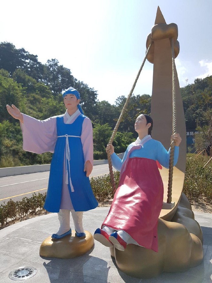 그네를 타는 춘향이와 이를 바라보는 이도령 그리고 남원을 상징하는 자원인 달이 형상화된 환영 조형물은 높이4m 너비4m로 남원을 방문하는 사람들에게 따뜻하고 포근한 느낌과 함께 달의 도시라는 남원의 상징성을 심어주기 위해서 설치됐다.