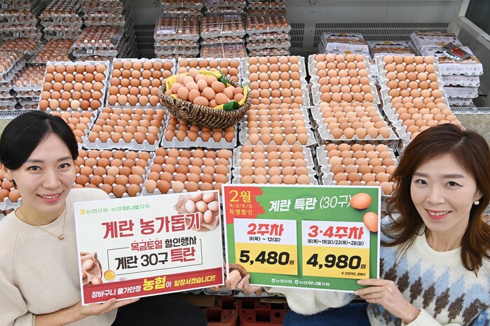 8일 서울시 서초구에 위치한 농협유통·농협하나로마트(하나로마트 양재점)에서 모델들이 2월 한 달 동안 진행되는 계란 30구 특란 할인행사를 소개하고 있다. 농협 하나로마트 38개 매장에서는 2월 9일부터 26일까지 매주 목·금·토·일요일 4일간 계란 30구 특란 할인행사를 진행하며, 특히 16~19일, 23~26일은 삼성카드로 결제시 500원 추가 할인을 받아 최대 34% 저렴한 4천원대 가격으로 구매할 수 있다. (사진=농협유통 제공)