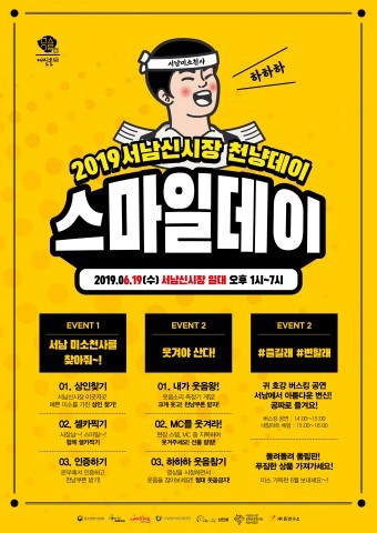 또한 시장 중앙무대에서는 천냥데이 부대행사로 △다트던지기 △서남 미소천사 찾기 SNS인증 행사 △웃겨야산다 이벤트 △천냥데이 BEST 참여업소 선정 △버스킹 공연 △스마일 네일아트 등 행사가 진행되어 소비자와 함께 소통할 수 있는 다채로운 즐길거리가 펼쳐질 예정이다.