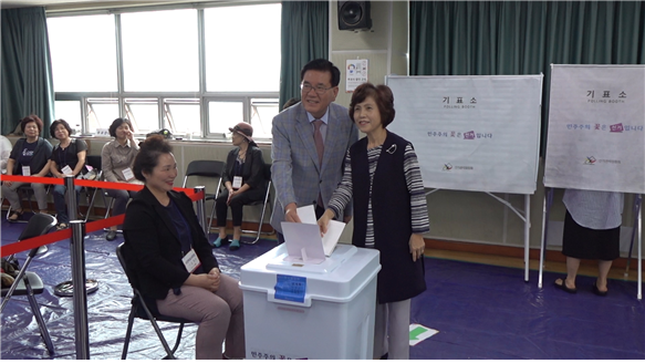 ▲유덕열 동대문구청장 후보가 부인 정승교 박사와 함께 사전투표를 하고 있다.(유덕열 후보 캠프 제공) |