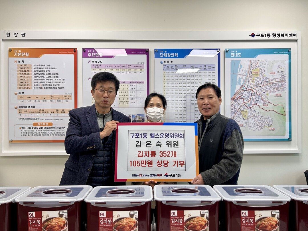 [로컬세계 = 김의준 기자]부산 북구 구포1동 행정복지센터는 지난 15일 구포1동 김은숙 헬스운영위원이 2025년 사랑의 김장나눔 행사에 사용해 달라며 김치통 352개를, 경동보신원 최우희 대표가 성금 50만원을 각각 기부했다고 밝혔다.