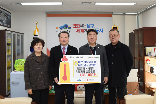 [로컬세계 부산=맹화찬 기자]바르게살기운동 부산 남구협의회가 최근 남구청에 튀르키예·시리아 지진 피해자들을 위한 특별성금 130만원을 전달했다고 남구청이 22일 밝혔다.