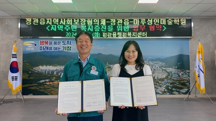 지난달 7월 30일 본격적인 사업 추진에 앞서 정관읍행정복지센터, 정관읍지역사회보장협의체, 마루성인미술학원이 업무협약식을 가지며, 미술교육과 전시회 개최 등 각종 미술 활동을 통한 주민 복지증진을 위해 상호협력하기로 했다.