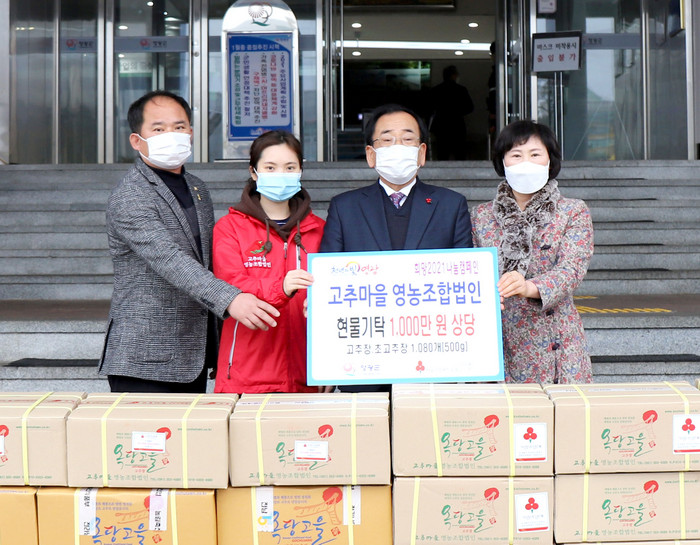 [로컬세계 오승용 기자]전남 영광군은 22일 영광고추마을 영농조합법인에서 설을 맞아 1000만원 상당의 태양초 가공품 고추장(500g) 720개, 초고추장(500g) 360개를 영광군에 기탁하며 '희망2021 나눔캠페인'에 동참했다고 밝혔다.