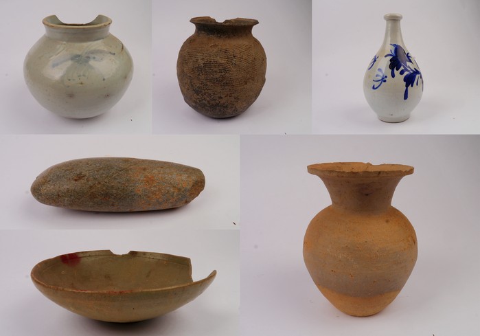 ▲신림초에서 고인돌박물관에 기증한 조갯날돌도끼, 청자발, 청화백자호 등 52점.(고창군 제공) |