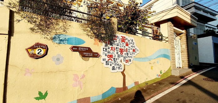 마산문학관에서 나와 노비산을 내려가는 길에는 벽화들이 반긴다. 도시재생사업의 일환으로 노산동 곳곳의 골목길을 꾸민 ‘가고파거리’ 중 하나다. 가고파거리는 지역사랑고향길, 나라사랑한글길, 문학관가는길, 노비산산책길, 도시사랑기찻길 5개 테마가 있는데, 이름에서 드러나듯 지역의 역사와 특색이 골목에 담겨 있다. 길이 끊어질 듯 다시 이어지고, 벽화와 조형물, 전망대가 어우러져 걷는 내내 지루하지 않다.