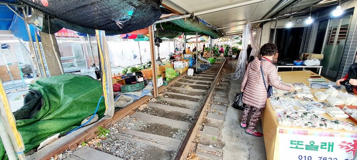 기찻길을 따라 걷다보면 이색적인 시장도 만날 수 있다. 바로 철길시장이다. 그 옛날 기차가 달리던 철길은 좌판으로, 상인들의 의자로, 손님과 노점의 경계가 되고 있다. 길이 포장되고, 아케이드가 설치되는 등 현대화 되는 요즘 시장에 비하면 철길시장은 날것 그대로의 모습을 간직하고 있다. 이 생경한 모습을 보기 위해 일부러 찾는 이들도 많다.