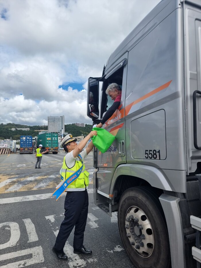 ▲부산남부경찰서와 한국교통안전공단 부산본부가 29일 신선대부두 일대에서 화물차 운전자들에게 안전운전 안내장을 건네는 등 '화물차 안전운전 공동캠페인'을 전개하고 있다. 부산남부경찰서 제공 |