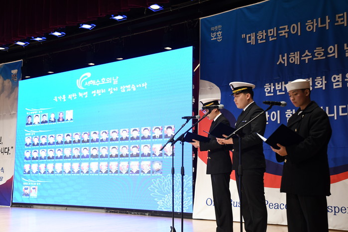 이날 기념식은 ‘그대들의 희생과 헌신, 평화와 번영으로 보답하겠습니다’를 주제로 거행되면서 서해수호 55용사 롤콜, 55 글자 카드 섹션을 이용한 국민화합 평화통일퍼포먼스 등이 진행됐다.