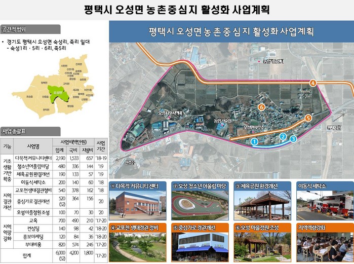 시에 따르면 지난 1월 경기도 및 농림축산식품부에 공모사업 계획서를 작성 제출했고 경기도 및 농림축산식품부의 발표 평가를 거쳐 9월초 기획재정부 3차 심의결과 오성면 농촌중심지 활성화사업, 팽성읍 대추리 창조적 마을 만들기(종합개발), 현덕면 덕목리 창조적 마을 만들기(중규모), 시·군 역량강화 등 4개 사업이 최종 확정됐다.