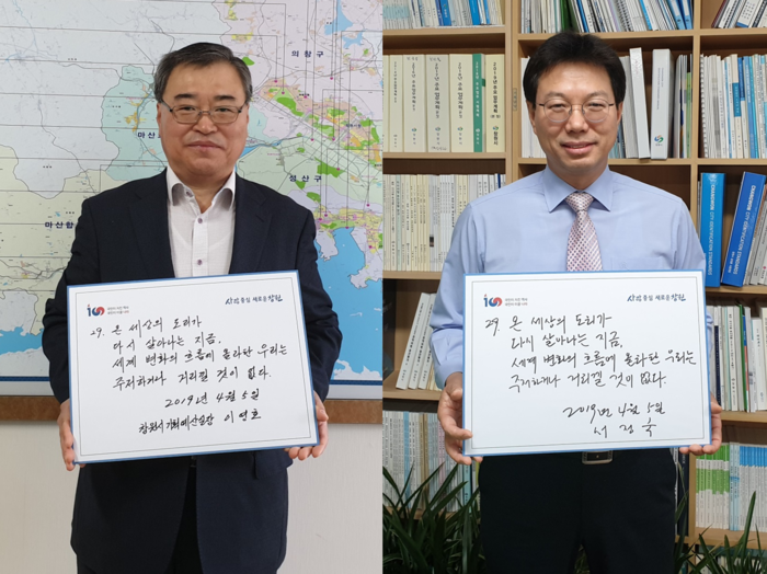 | ▲3·1운동 독립선언 챌린지에 동참한 창원시 이영호 기획예산실장(왼쪽)과 서정국 기획관.(창원시 제공) |