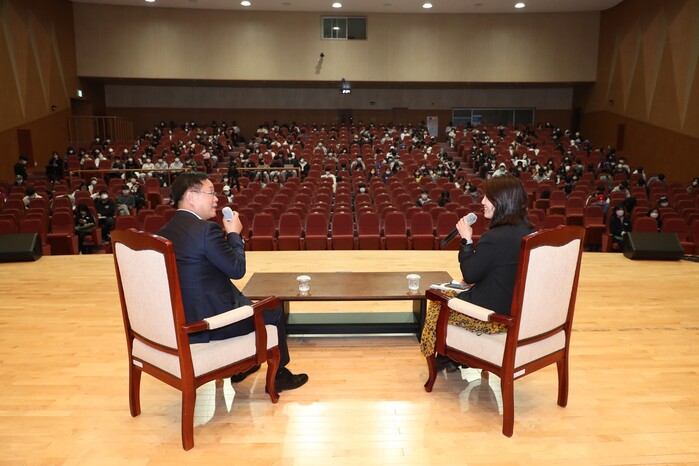 홍남표 시장은 지난 수십년 간의 공직생활을 통해 얻은 경험과 이를 바탕으로 한 창원특례시 시정방향과 미래비전에 대해 학생들과 진솔한 대화로 소통해 공감과 호응을 얻었다.