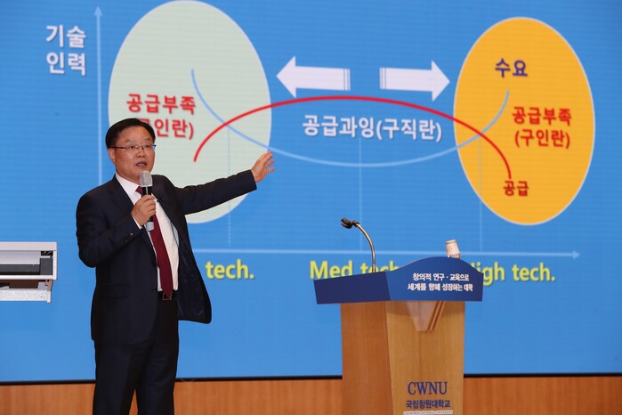 [로컬세계=권인진 기자] 홍남표 창원특례시장은 25일 오후 2시 창원대학교 글로벌대강당에서 ‘정치와 과학기술’이라는 주제로 창원대 학생을 대상으로 특강하는 시간을 가졌다.