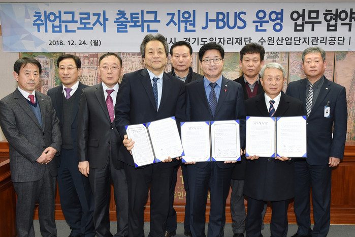 경기도 수원시와 경기도일자리재단, 수원산업단지관리공단은 24일 시청 상황실에서 ‘수원일반산업단지 취업근로자 출퇴근 지원 J-BUS 운영 업무협약’을 체결했다.
