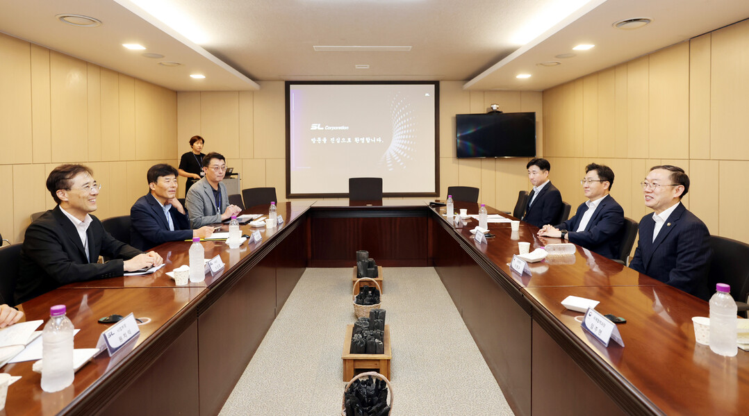 이명구 관세청장(오른쪽 첫 번째)이 29일, 경북 경산에 소재한 에스엘주식회사를 방문하여 자동차부품 업계의 대미 수출 지원을 위한 간담회를 개최하고 있다. 관세청 제공