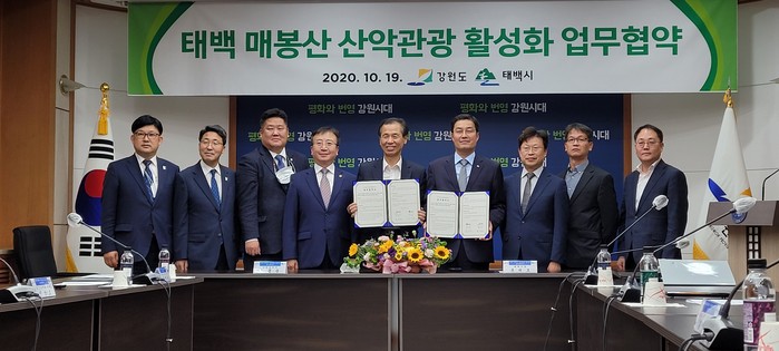 [로컬세계 박상진 기자]강원 태백시(시장 류태호)는 19일 강원도(도지사 최문순)와 강원도청 본관 소회의실에서 태백 매봉산 산악관광 활성화를 위한 업무협약을 체결했다.