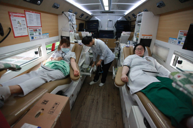 | ▲안동병원 의료인들이 헌혈을 하고 있다. |