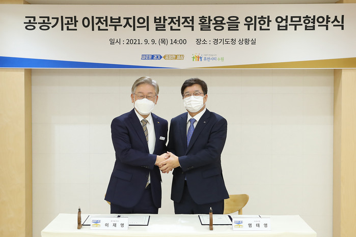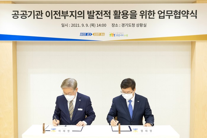 [로컬세계 김병민 기자]수원시와 경기도는 9일 경기도청 상황실에서 ‘공공기관 이전부지의 발전적 활용을 위한 업무협약’을 체결하고, 공공기관 이전부지 활용을 위해 적극적으로 협력하기로 했다.