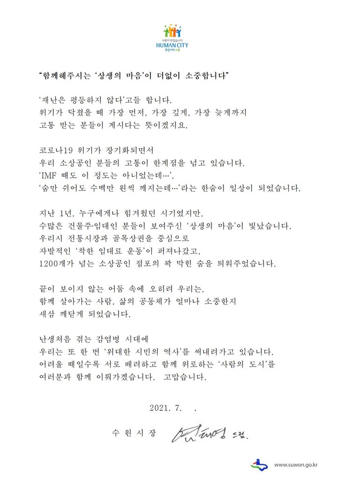 염태영 시장은 “코로나19가 장기화되면서 우리 소상공인 분들의 고통이 한계점을 넘고 있다”며 “지난 1년 여, 누구에게나 힘겨웠던 시기였지만 전통시장과 골목상권을 중심으로 자발적인 ‘착한 임대인 운동’이 퍼져나갔다”고 말했다.