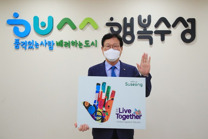 [로컬세계 박세환 기자]김대권 대구 수성구청장은 15일 코로나19 이후 늘어난 인종차별과 혐오범죄에 대응하기 위해 외교부와 유네스코가 공동으로 추진하는 글로벌 캠페인 ‘리브투게더(LiveTogether) 챌린지’에 동참했다.