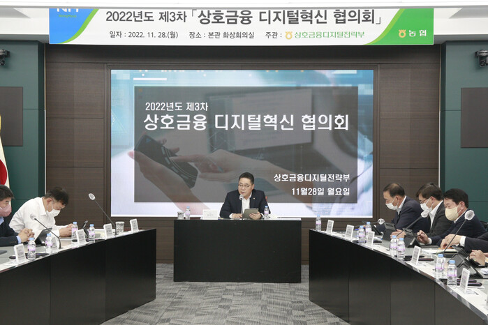 농협(회장 이성희) 상호금융은 지난 28일 서울시 중구 농협중앙회 본관에서 김석기 상호금융디지털금융본부장을 비롯한 직원들이 참석한 가운데 2022년 제3차 ‘상호금융 디지털혁신 협의회’를 개최하고 디지털금융 관련 주요 현안을 논의했다.