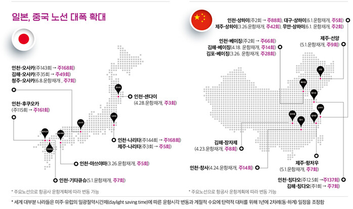 인천국제공항 출발 나리타(주 144회→168회), 오사카(주 143회→168회), 상하이(주 2회→88회), 칭다오(주 12.5회→137회) 노선 등이 증편된다.
