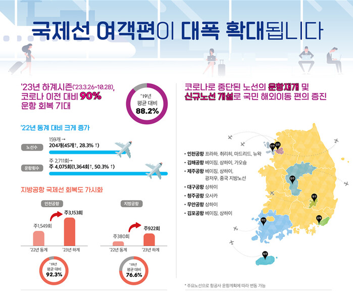 이와 함께 국토부는 국제선 조기 회복을 위해 지방공항 취항과 인천공항 환승여객 유치도 확대할 계획이다.
