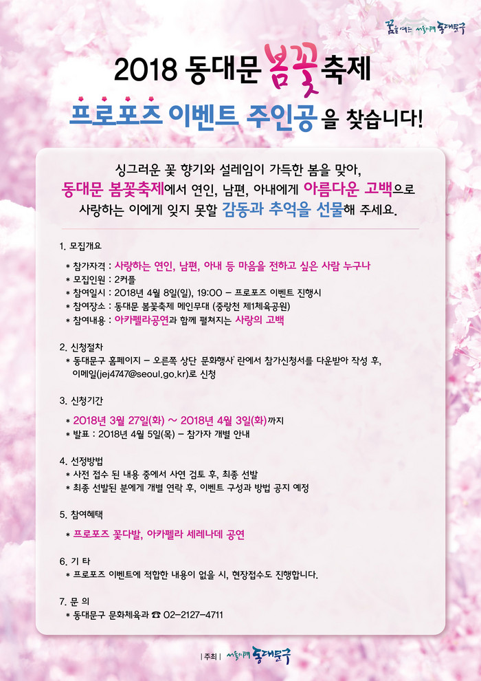 [로컬세계 임종환 기자]서울 동대문구(구청장 유덕열)가 내달 7∼8일 장안벚꽃로에서 개최하는 ‘2018 동대문 봄꽃축제’에서 프로포즈 이벤트의 주인공을 모집한다고 27일 밝혔다.