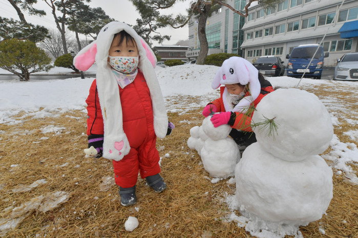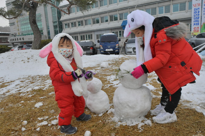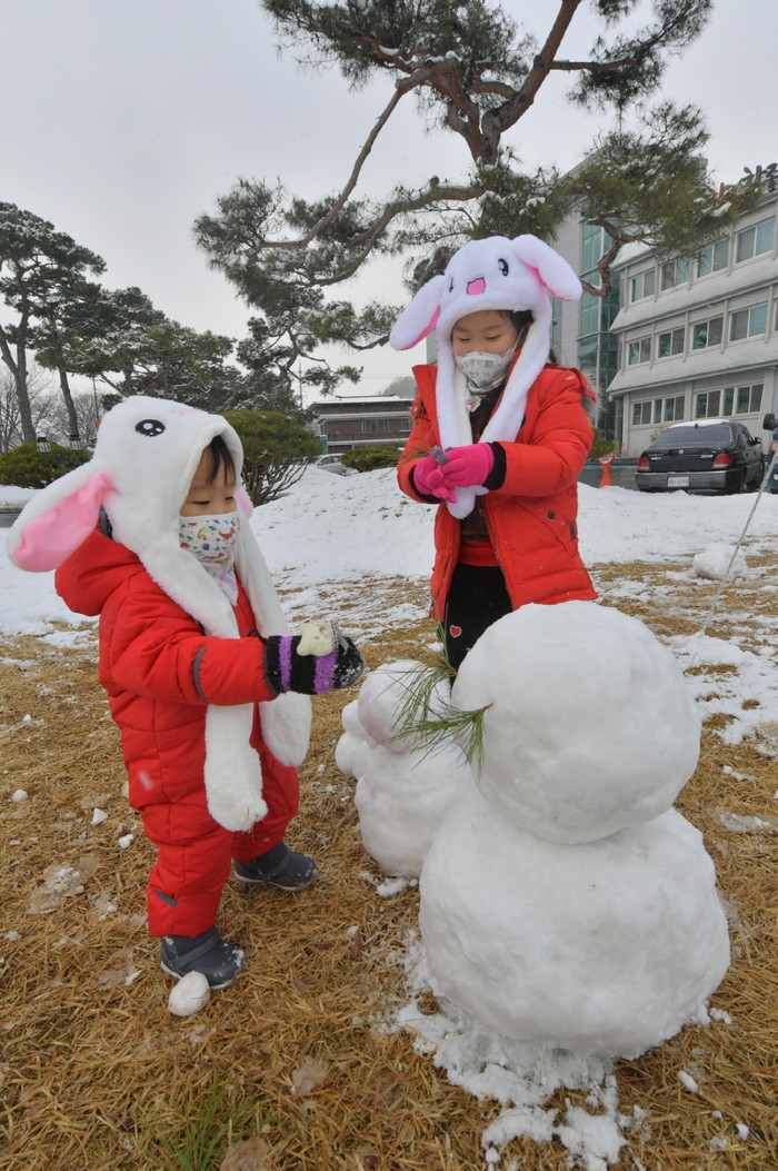전북 순창군청 잔디광장에 2020년 첫눈이 쌓였다. 신나게 만든 눈사람에 아이들이 눈코입을 만들고 있다.(사진=순창군 제공)