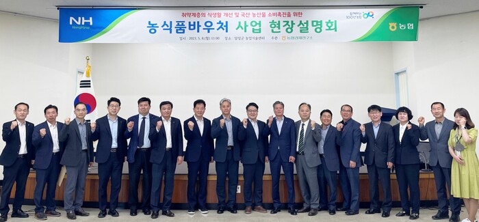 ▲ 농협경제연구소는 8일 대구광역시 달성군에서 '농식품바우처 사업 현장설명회'를 실시하고 기념촬영을 하고 있다. 농협 제공 |