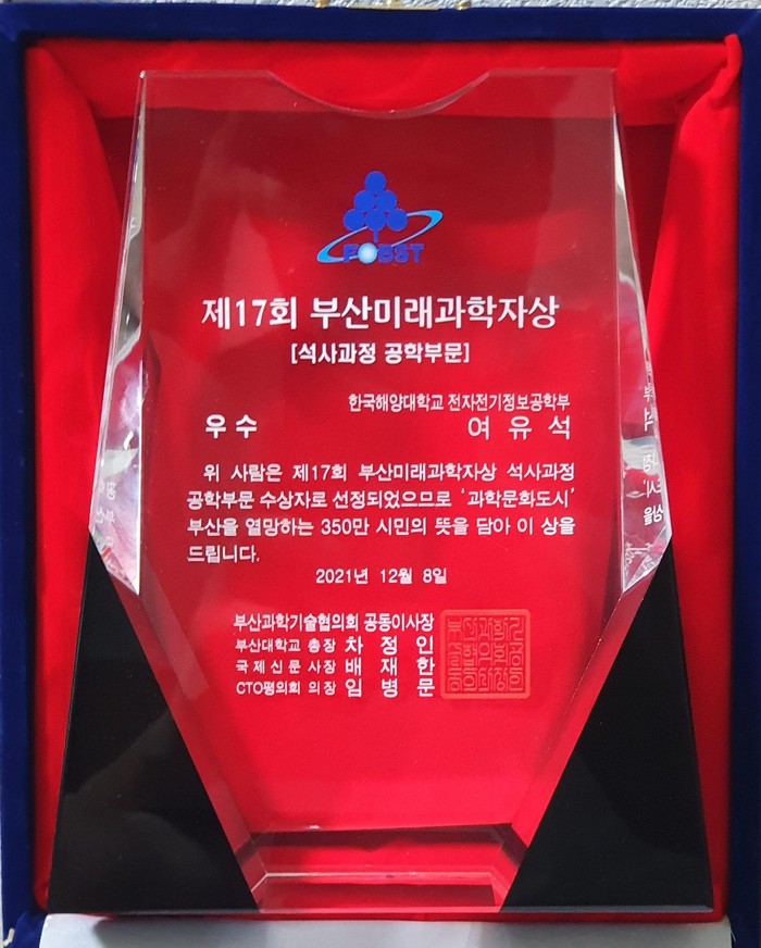 [로컬세계 맹화찬 기자]한국해양대학교(총장 도덕희) 전자전기정보공학부 전파융합공학전공 석사과정(2년) 여유석(지도교수 민경식) 학생이 ‘제17회 부산미래과학자상’ 석사과정 공학부문 우수상에 선정됐다.