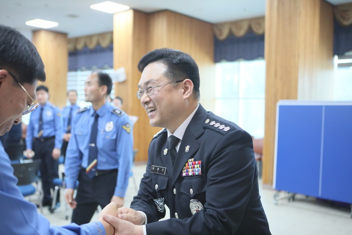 | ▲제25대 이광진 부산해양경찰서장이 직원들과 인사를 나누고 있다.(부산해경 제공) |