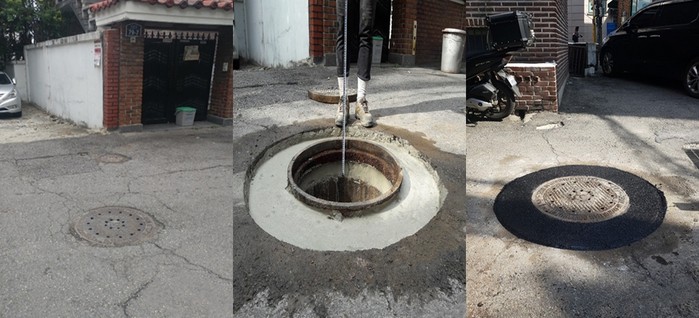 ▲불량맨홀 정비 전(왼쪽), 정비 중(가운데), 정비 후(오른쪽)/ 관악구 제공 |