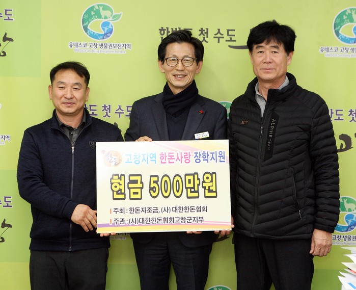 ▲한돈협회 고창군지부에서 고창 장학재단에 500만원을 기탁했다.(고창군 제공) |
